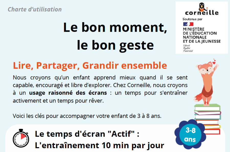 J’ai découvert que Corneille, l’appli numérique en lecture, que j’ai utilisé en classe cette année, avait abordé ce sujet de « l’écran raisonné » à travers une charte d’utilisation du numérique. Les conceptrices ont même eu une interview récemment sur Europe 1 et si cela vous intéresse, elles participent à l’émission matinale sur Sqool TV qui sera diffusé le 10 avril 2026 et que vous pourrez retrouver sur Youtube.